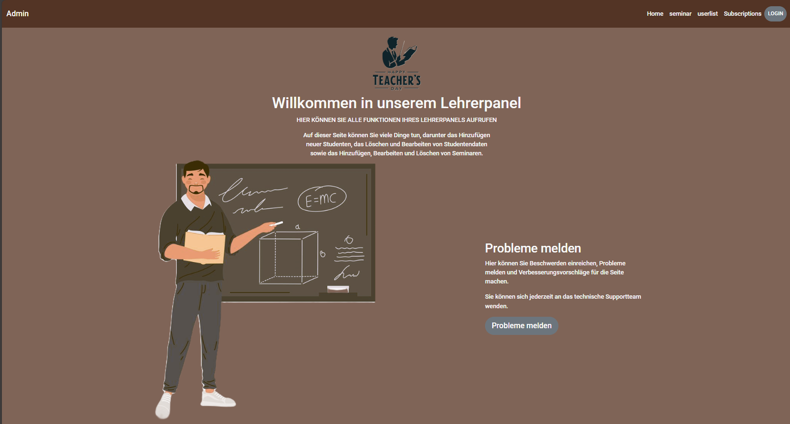 Umschulungs-Website mit Admin-Bereich für Lehrer. Lehrer können sich registrieren, anmelden und abmelden, Schülerdaten verwalten und kontrollieren sowie Inhalte für Blog & Seminare verwalten. Die Website umfasst mehrere Seiten wie Home, Blog & Seminare und weitere Informationsseiten.