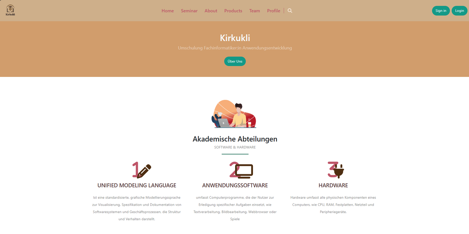 Website für Schüler in der Umschulung mit Registrierung und Login. Nutzer können ihre Daten anzeigen und ändern, an Blogbeiträgen und Seminaren teilnehmen sowie Lernprodukte einsehen. Die Startseite zeigt alle Umschulungsinfos, ergänzt durch About-, Team-, Profil- und Logout-Bereich.