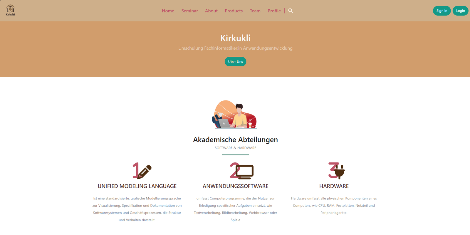 Website für Schüler in der Umschulung mit Registrierung und Login. Nutzer können ihre Daten anzeigen und ändern, an Blogbeiträgen und Seminaren teilnehmen sowie Lernprodukte einsehen. Die Startseite zeigt alle Umschulungsinfos, ergänzt durch About-, Team-, Profil- und Logout-Bereich.